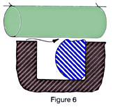 Figure 5 shows the extreme case of deformation just before failure. Note that a small portion of the rubber material has been forced into the small clearance beyond the groove. Assuming the rubber has reached its limit of flow under pressure, further increase of force will result in failure by shear or extrusion as shown in Figure 6. The clearance allowed will bear a direct relation to the force causing failure.
